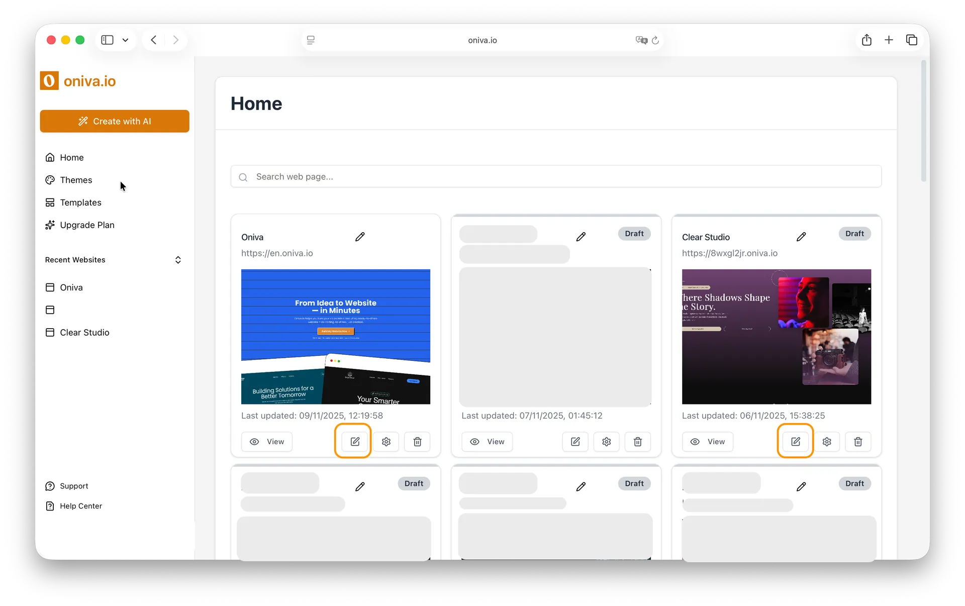 On your Home page, where all your projects are listed, find the website that contains the page you want to edit and click the Edit button.